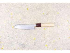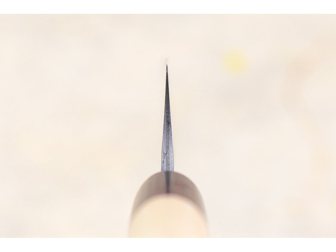 When you pick up the Yuki, you’ll notice just how light it is. The steel is hammered thinner than your average knife, which lets it fly through dense veggies with ease. Shirogami, or ‘white carbon’ in English, is a very traditional steel prized by blacksmiths and knife nerds alike for its great edge retention and legendary sharpness. Yuki knives are clad in softer stainless steel, so only the very edge has to be kept dry to prevent rust. This line is one of our most popular and a frequent gateway into the world of hand-hammered knives.