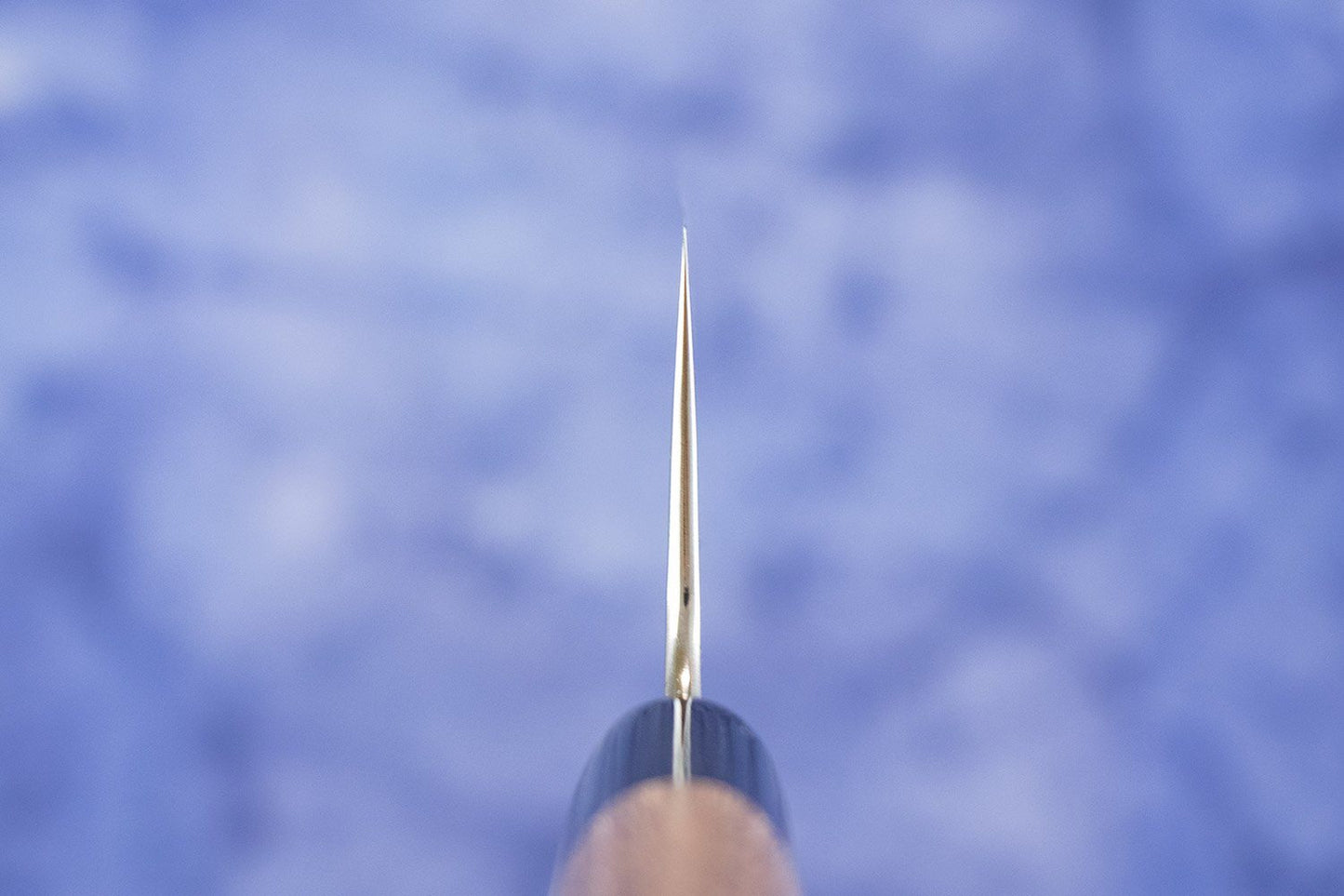 Masashi-san made this knife from a phenomenal steel called SLD, which he can push to the absolute limits of hardness due entirely to his knifemaking genius and a few top-secret techniques. He sharpens this knife with his unique trademark edge, making the back end a little tougher for chopping and the tip finer for delicate work.
