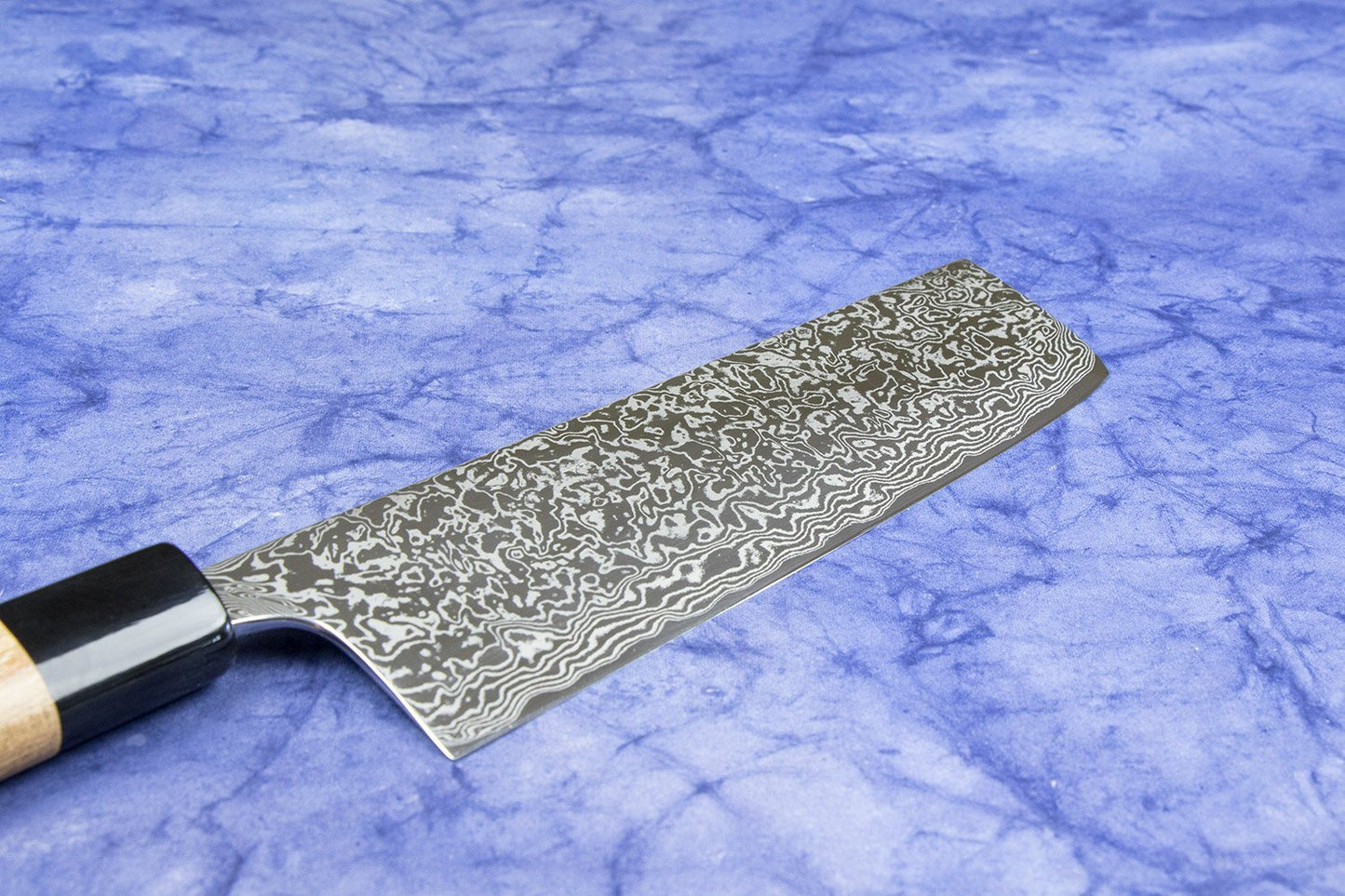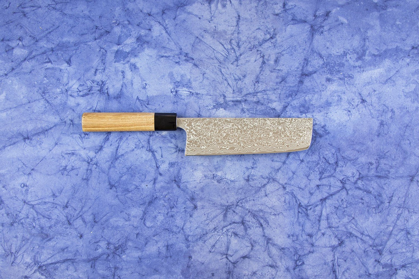 About the Shape A Nakiri is a vegetable knife. Under utilized in the Western kitchen, the Nakiri’s flat blade is meant for the push/pull chopping of vegetables. Since the entire flat edge of the knife kisses the cutting board at once, you wont be turning the vegetable into an accordion. Accordion vegetables are still connected like a paper doll after you're “done” cutting them. To truly understand the awesomeness of a Nakiri we recommend making onion soup your first night with the knife. The ease of chopping will blow you away.