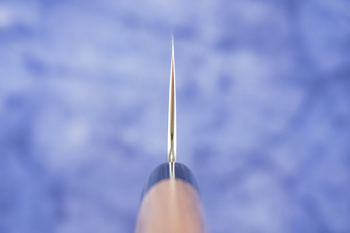 Masashi-san made this knife from a phenomenal steel called SLD, which he can push to the absolute limits of hardness due entirely to his knifemaking genius and a few top-secret techniques. He sharpens this knife with his unique trademark edge, making the back end a little tougher for chopping and the tip finer for delicate work.