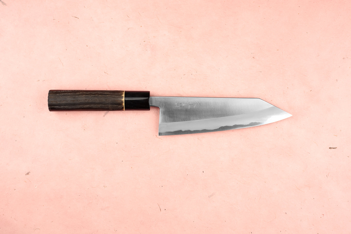 These blades are forged from Aogami #2 with stainless cladding, making them high-performance but relatively low maintenance. The burnt chestnut and water buffalo horn handle is the perfect ribbon on a stunning package.