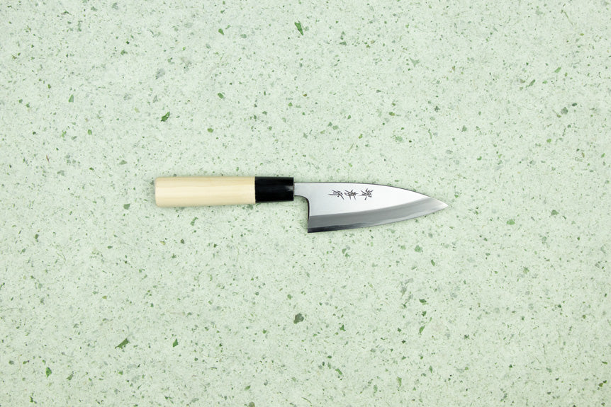 The Suigyu Kasumitogi is perfect for a young sushi chef or amateur home cook wanting to break into the world of sushi. Shirogami (white) carbon is pretty darn great. It’s super easy to sharpen, takes a brilliantly sharp edge, cuts like silk, and is very rugged for its hardness. Just keep it dry to avoid rust!