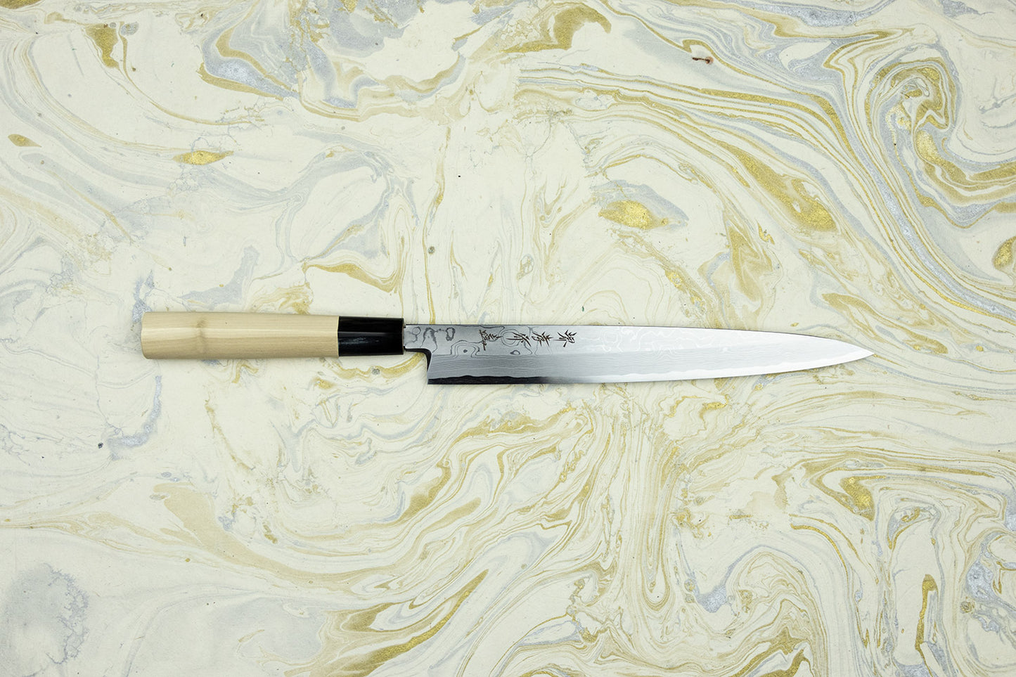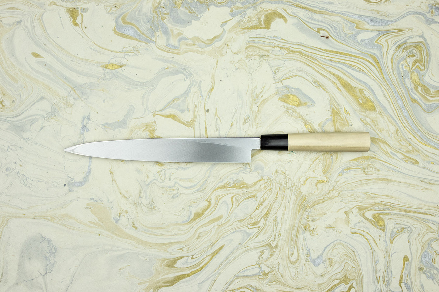 About the Shape -Yanagibas are long, thin, single-bevel knives ground and sharpened on one side. Translating to “willow’s leaf,” they’re graceful and elegant like their name suggests. Yanagibas are commonly used for slicing sashimi, but can also be used for carving other meats like roast beef and prime rib.