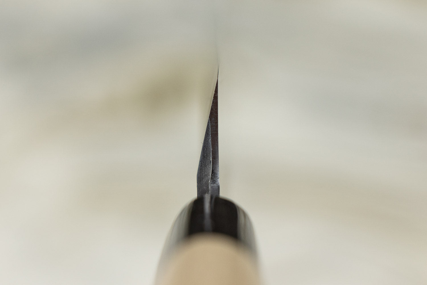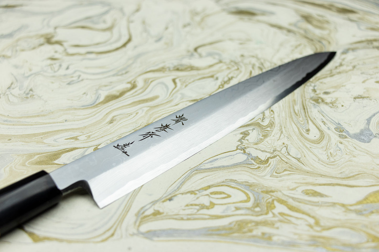 This stunning, flashy design makes for a knife worthy of a skilled chef. Clean and traditional, yet highly artistic. These blades are for chefs who need a knife that matches their skill level. Shirogami (white) carbon is pretty darn great. It’s super easy to sharpen, takes a brilliantly sharp edge, cuts like silk, and is very rugged for its hardness. Just keep it dry to void rust!