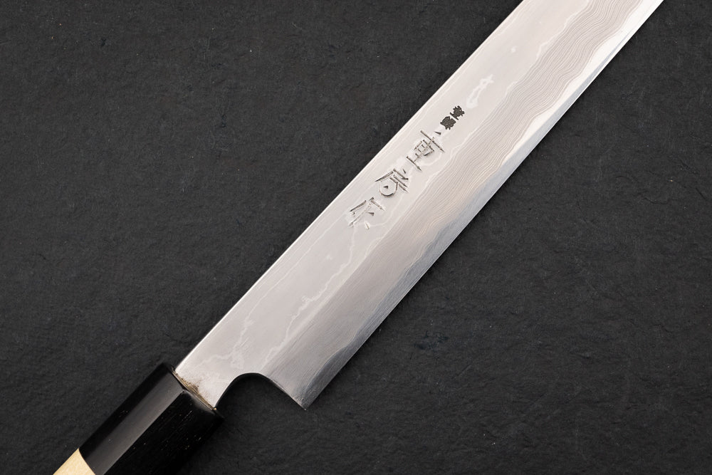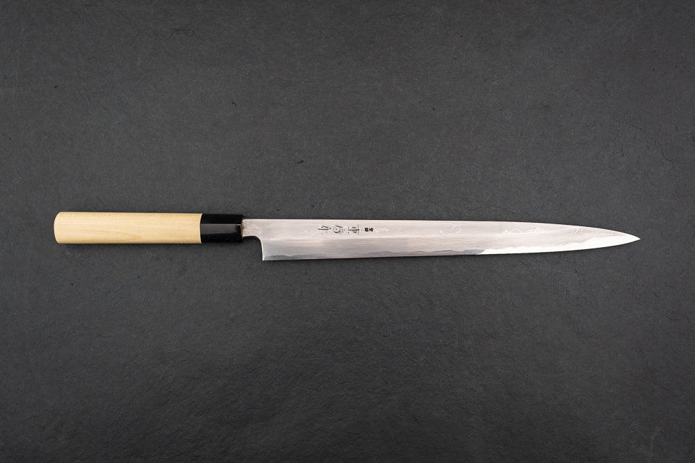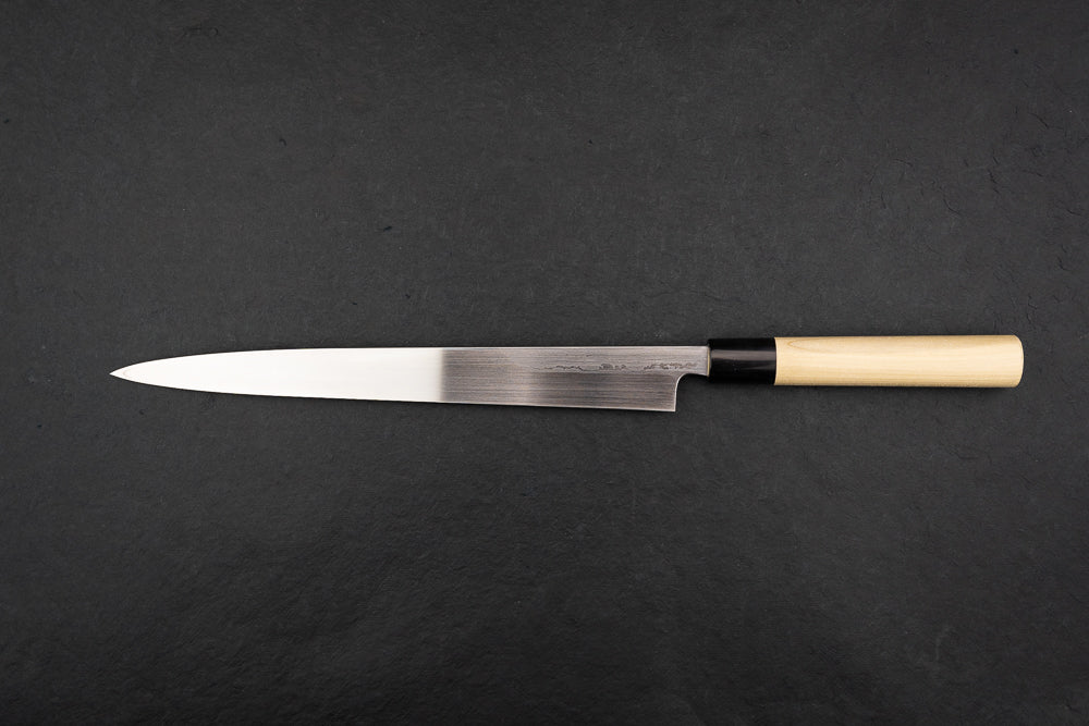 About the Shape - The Yanagiba is a slicer’s dream. Graceful, sexy, and capable of amazing sharpness, you’ll find a Yanigiba in the hands of every sushi chef worth their salt. Yanagi means “willow leaf” and refers to this knife’s long, narrow shape. The Yanagiba is a traditional Japanese blade that is only sharpened on one side. This is called “single bevel.” Traditionally used for slicing sashimi, they are equally at home with a roast beef, ham, or calf’s liver. Once you go Yanagiba, you’ll never go back.