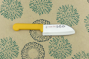 Some facts about this tiny banger of a knife: If it wasn’t glaringly obvious, it was designed for children to learn with. It features a rounded tip and heel for extra safety and comes in three radical colours (yellow, blue, pink). The blade is adorned with a chicken, fish, a happy tomato, and a smiley face that inexplicably has only one eyebrow. I often wonder what happened to that extra eyebrow. Did he lose it in a tragic accident?