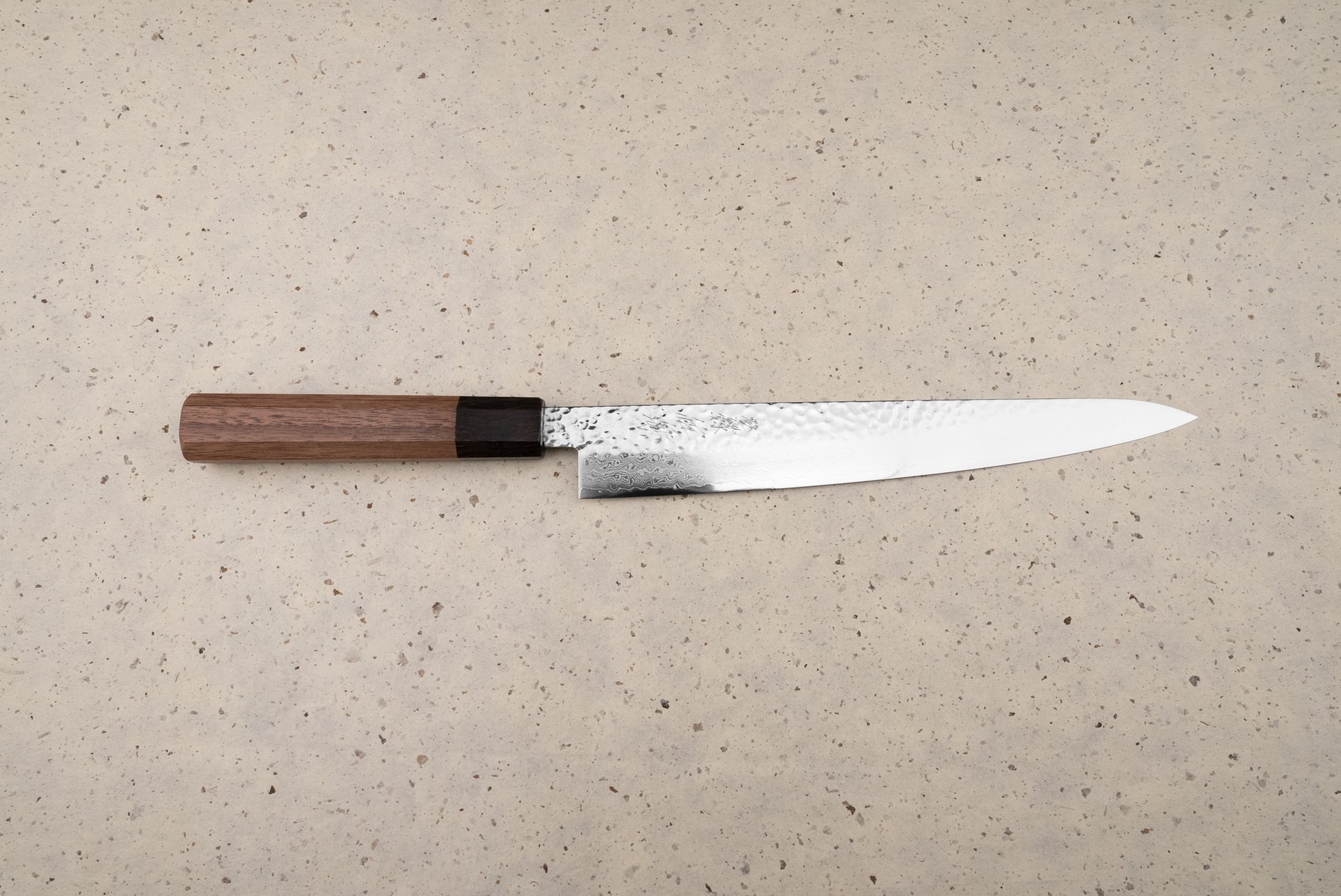 I never get sick of looking at this knife. It’s so pretty. I've always said a good knife should inspire you to cook, and this one definitely inspires me. When it comes time to cut, you’re in good hands thanks to the VG10 steel in the blade. It keeps an obscenely sharp edge but doesn’t require a bunch of care like some other fancy knives do. The wooden octagonal handle is very traditional and very comfortable. I find the grooves lock into my hand, making the knife feel like an extension of my wrist.