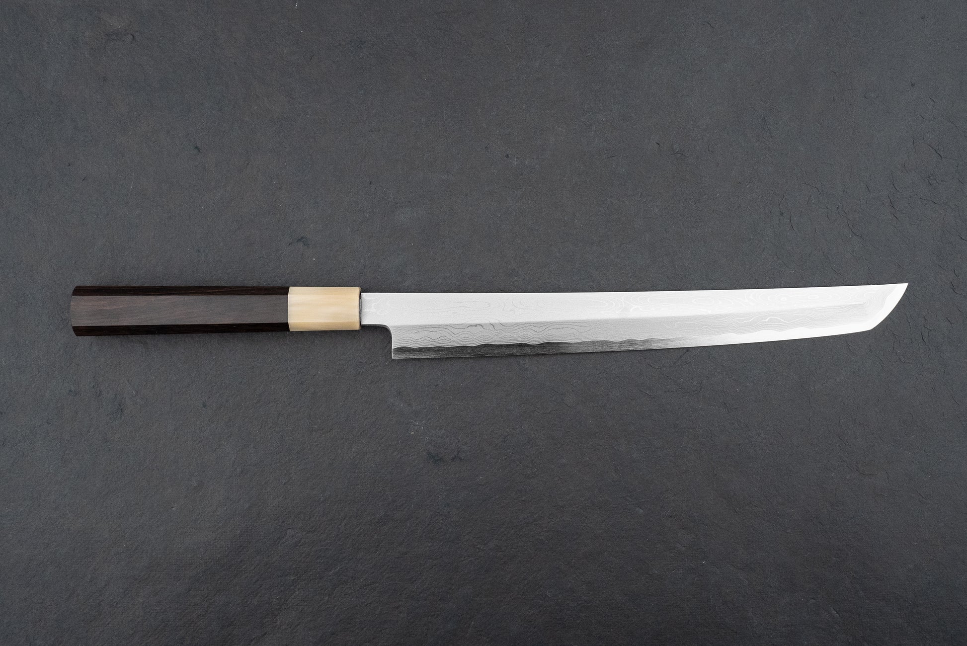 About the Shape - The Sakimaru Takobiki is a type of shape within the Yanagiba family. The Yanagiba is a slicer’s dream. Graceful, sexy, and capable of amazing sharpness, you’ll find a Yanigiba in the hands of every sushi chef worth their salt. Yanagi means “willow leaf” and refers to this knife’s long, narrow shape.